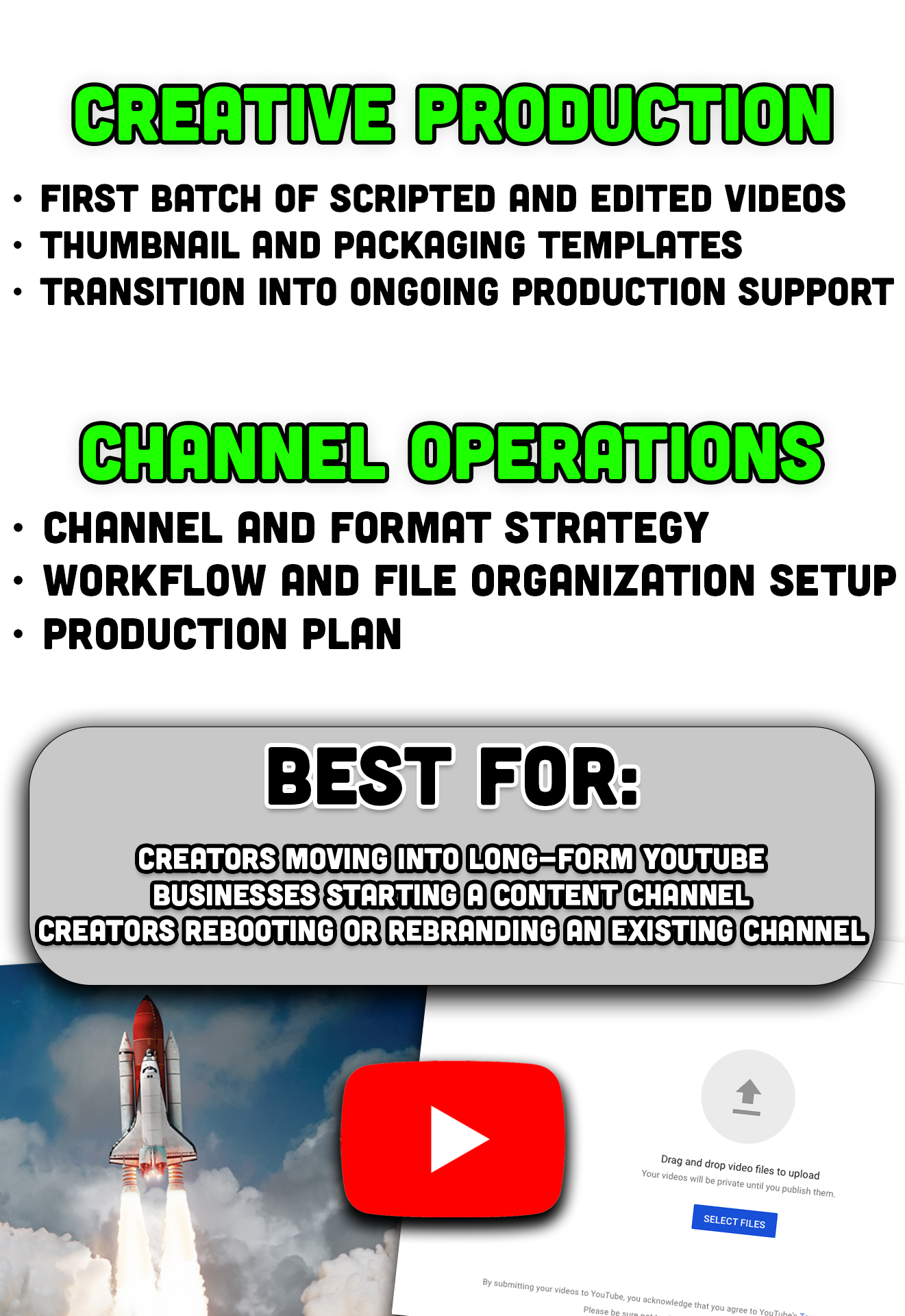 I help creators, founders, and teams launch or relaunch YouTube channels by building clear formats, repeatable workflows, and strong packaging so they can start publishing with confidence instead of guessing what to do next.